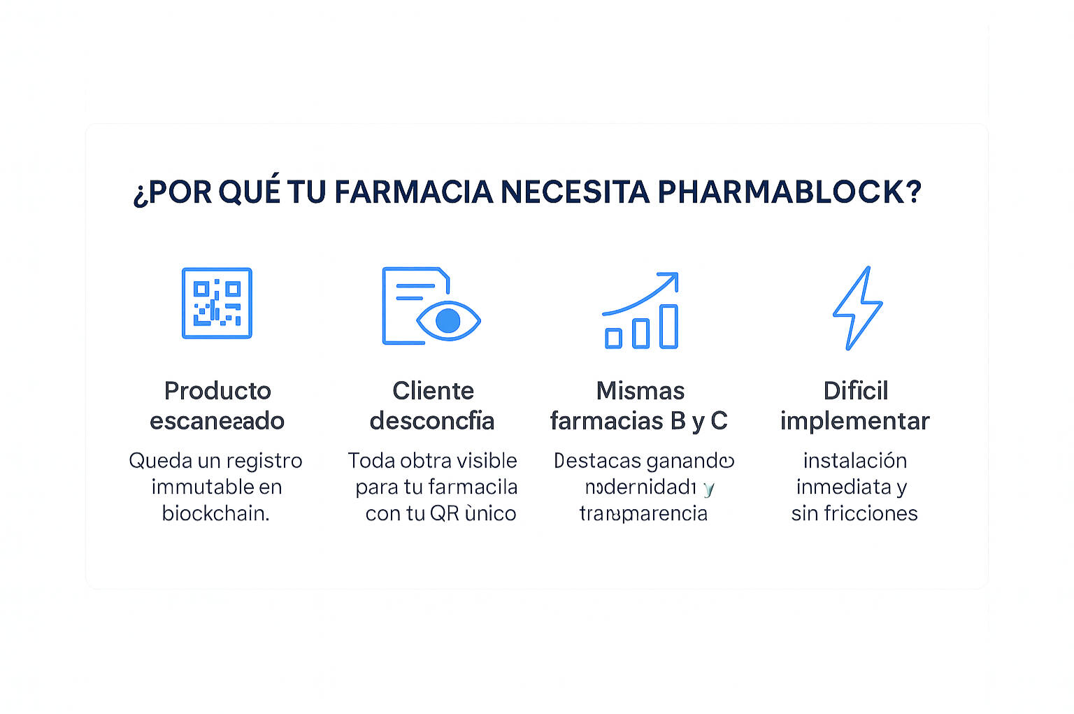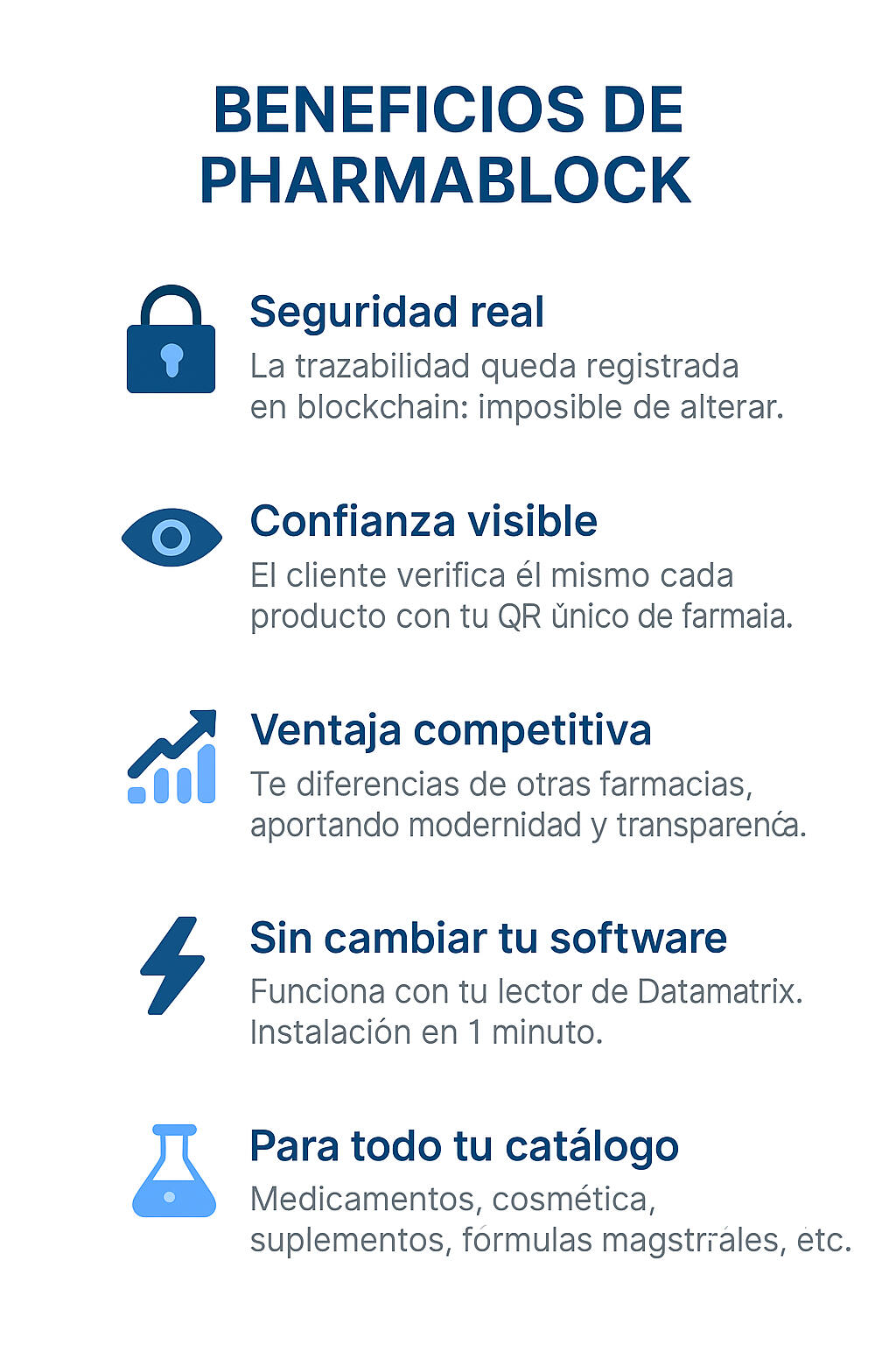 Porque PharmaBlock transforma el Datamatrix que ya usas en una experiencia visible que genera confianza, moderniza tu farmacia y diferencia tu servicio frente a la competencia.